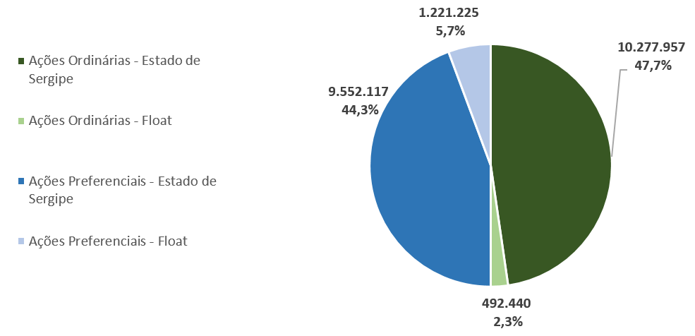 A estrutura societária do Banese compreende 21.548.228 milhões de ações, divididas em partes iguais entre ações ordinárias e ações preferenciais.